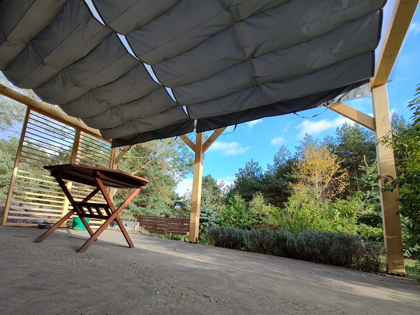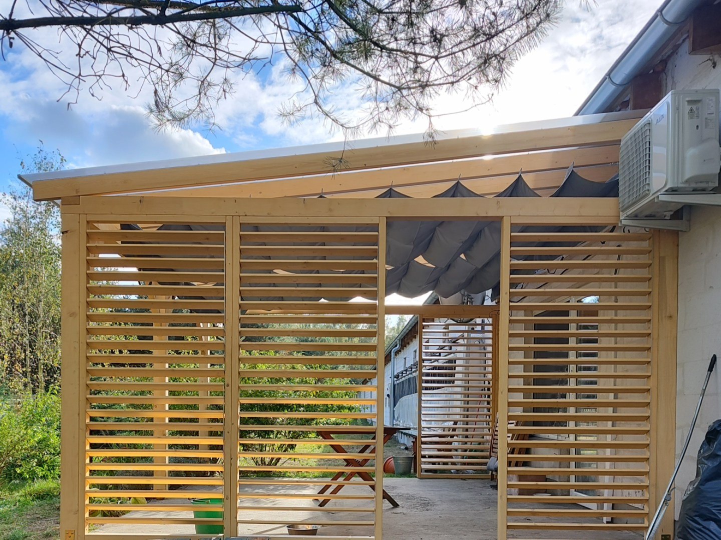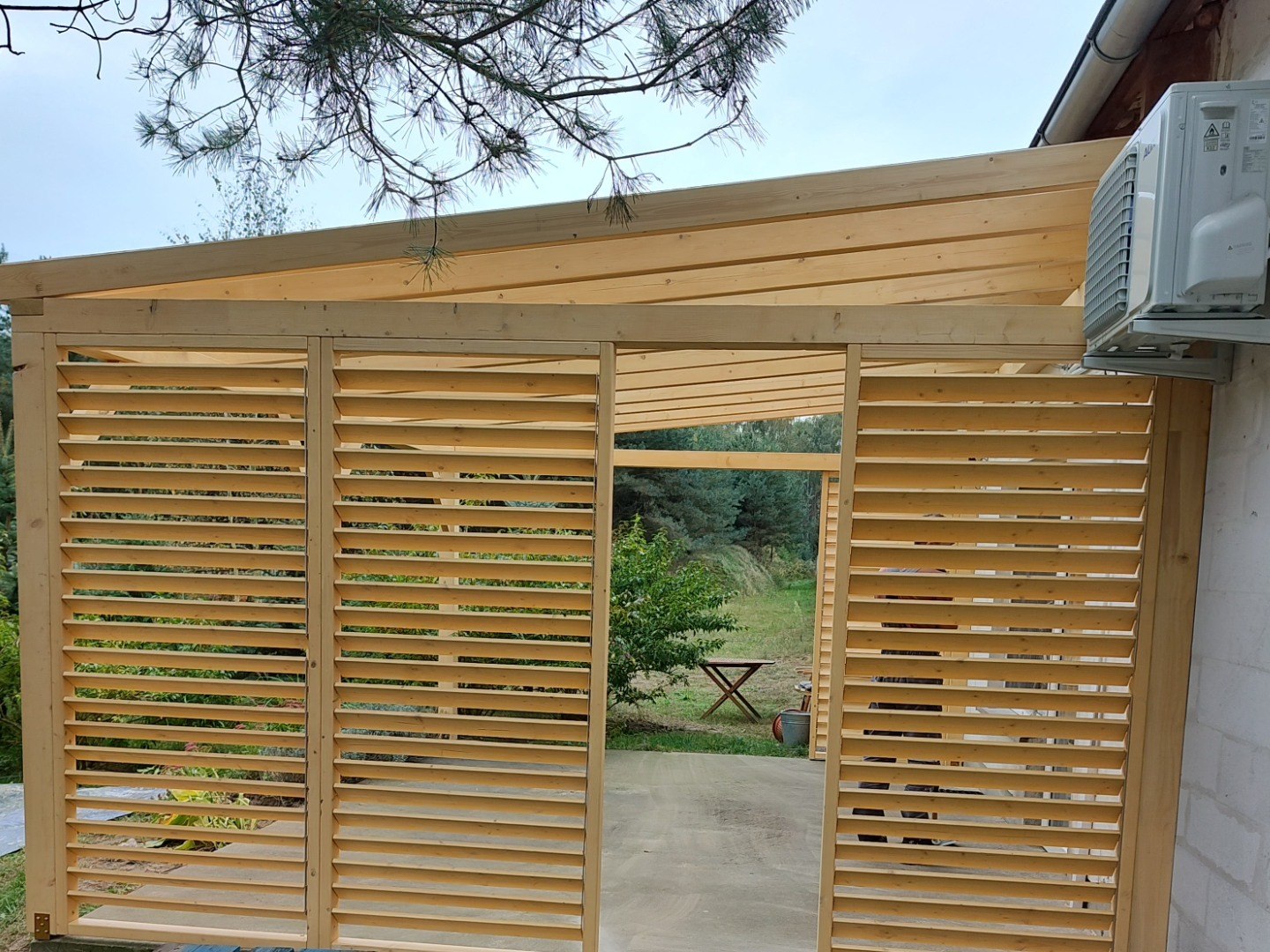 Zabudowa drewniana z ruchomymi żaluzjami oraz zadaszeniem