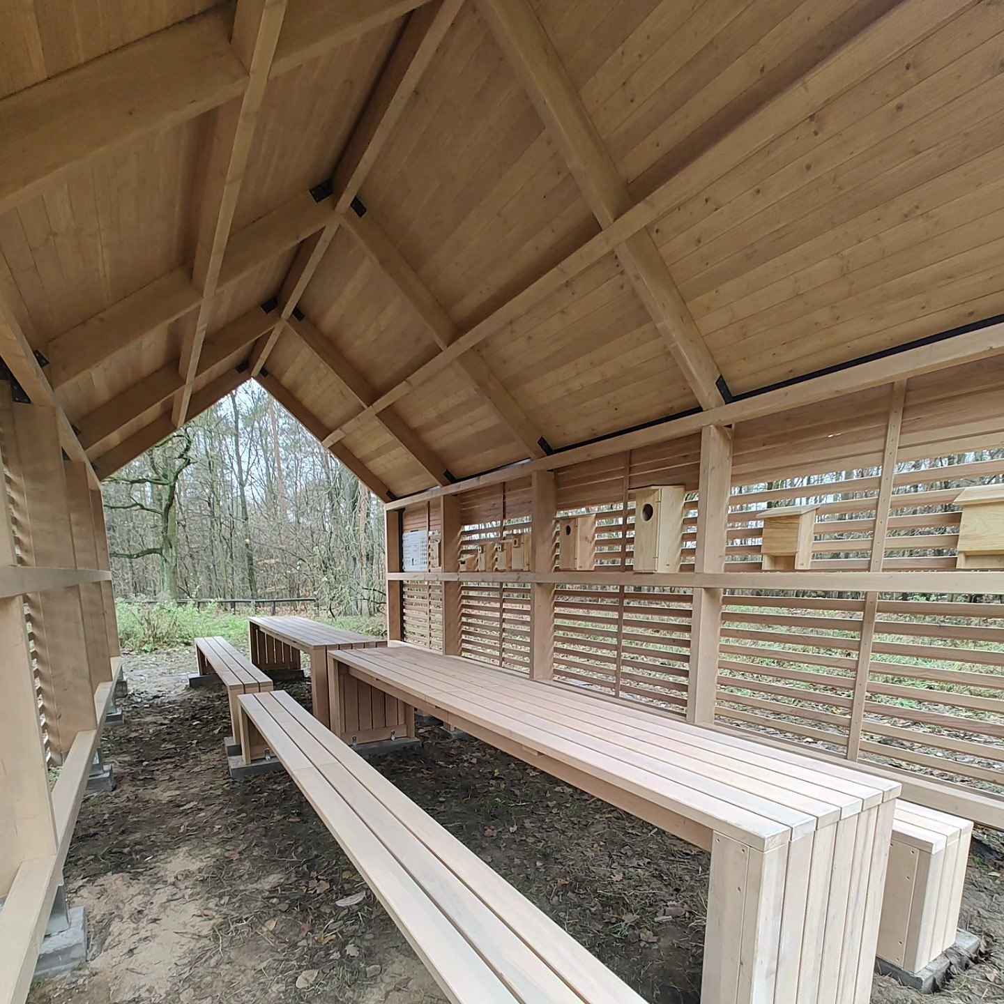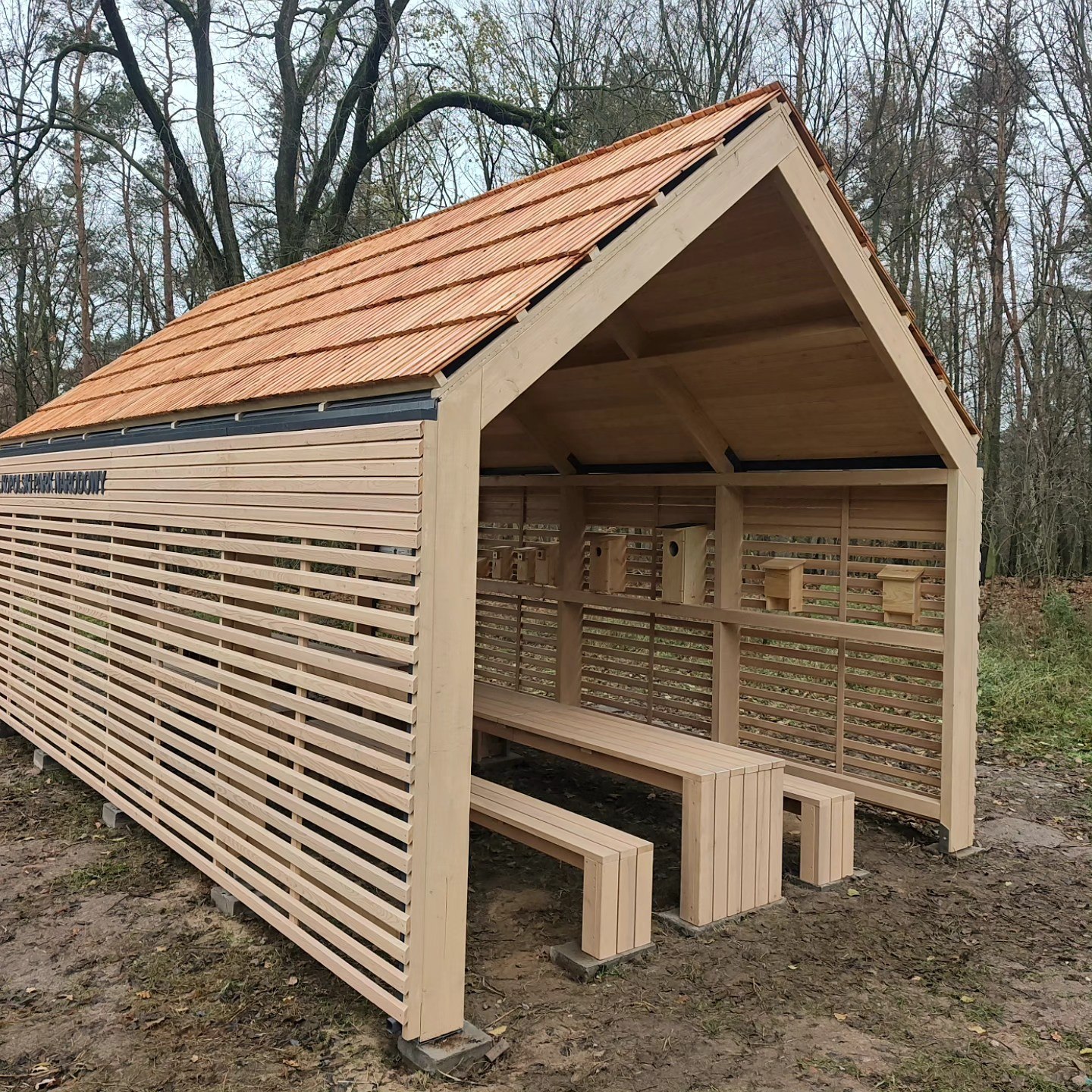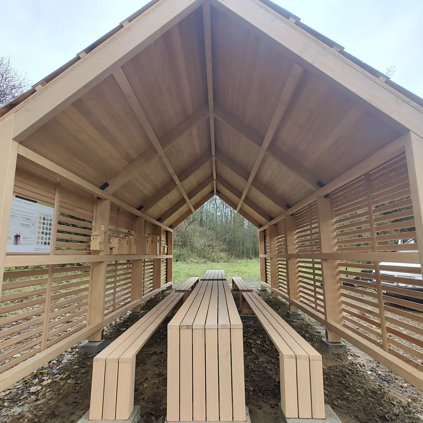 Duża wiata edukacyjna z lamelową elewacją modrzewiową