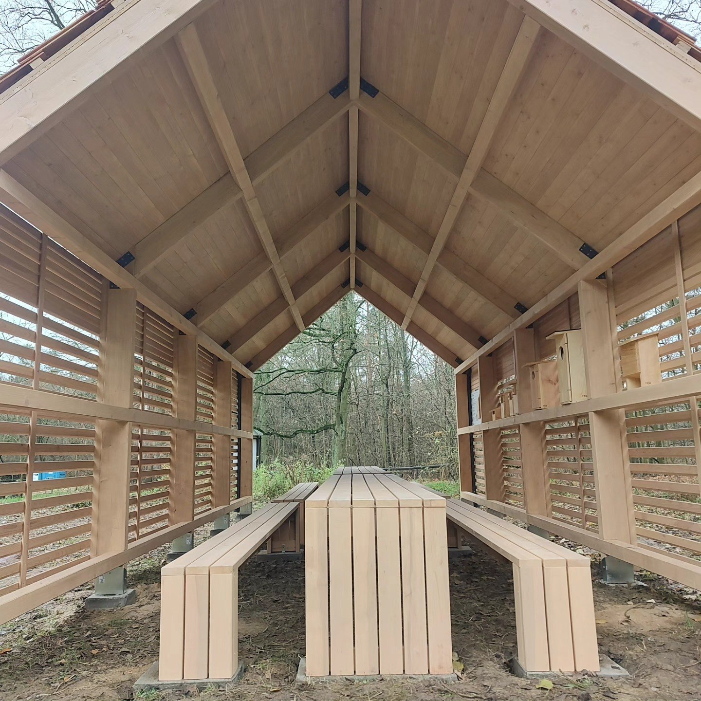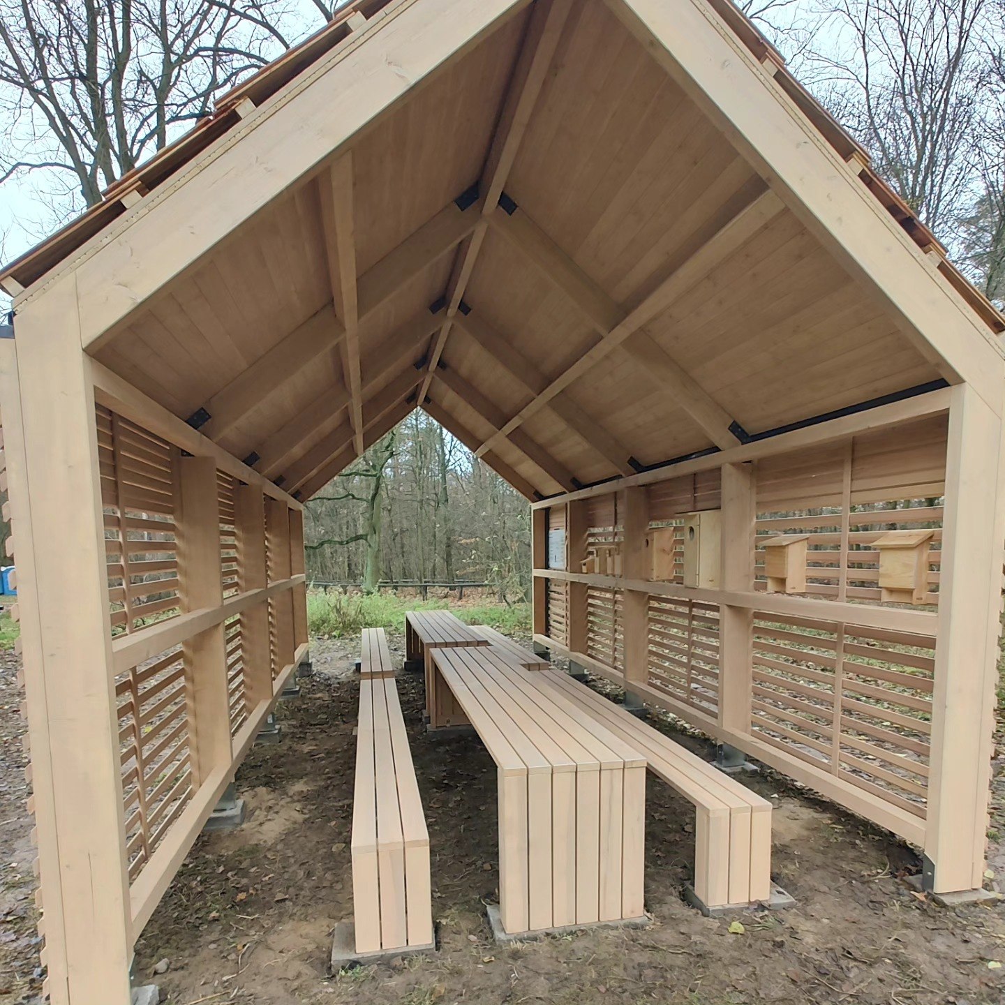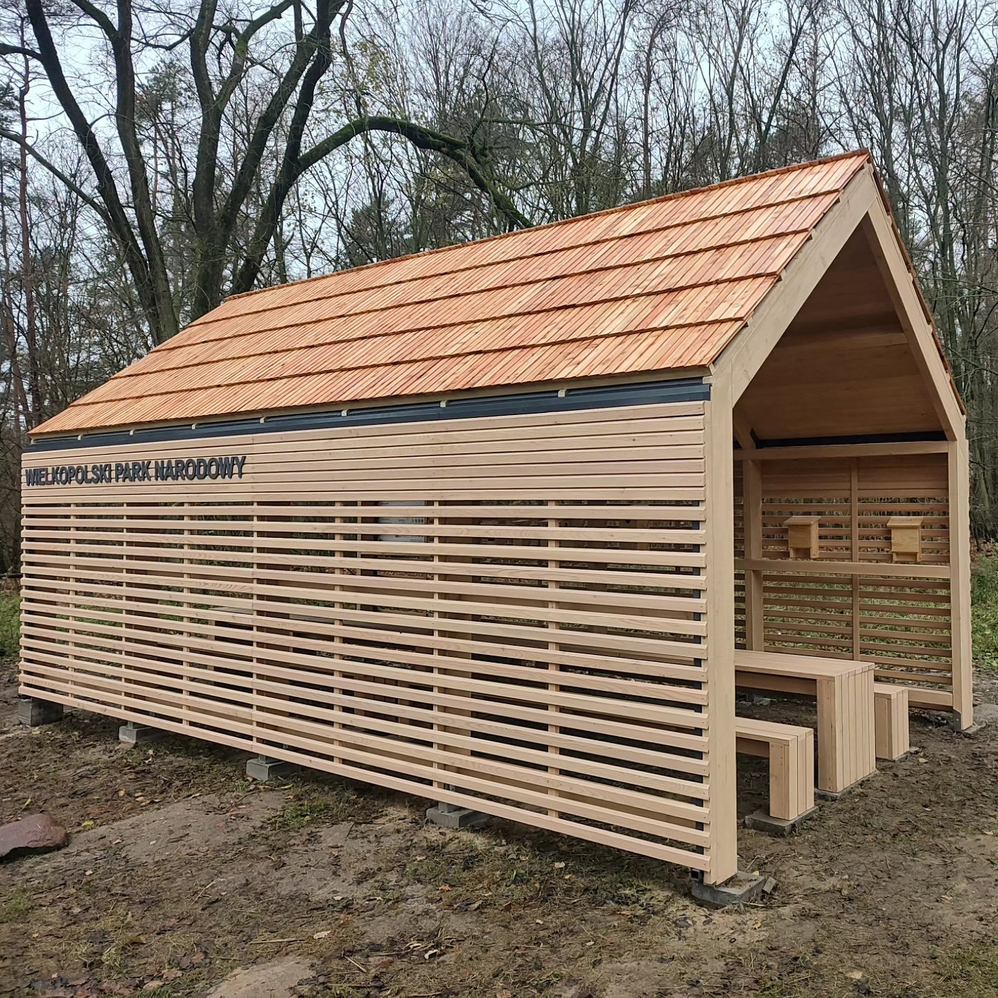 Duża wiata edukacyjna z lamelową elewacją modrzewiową