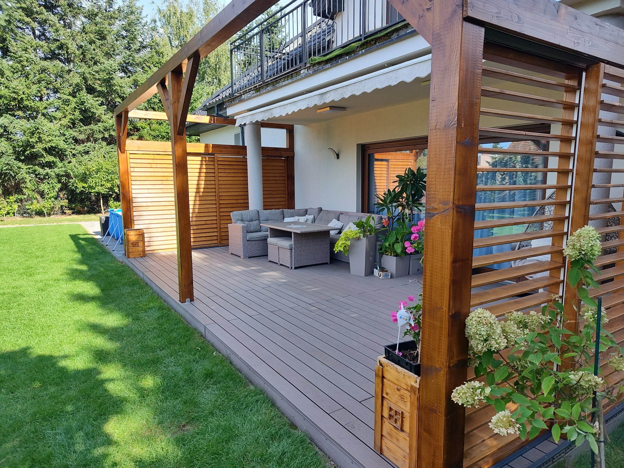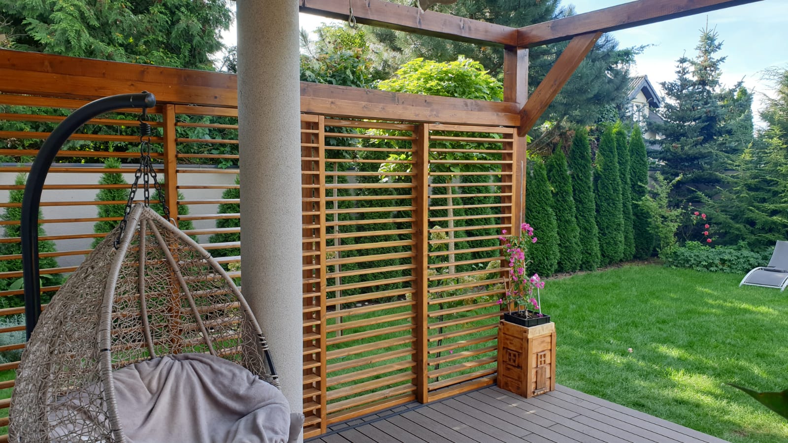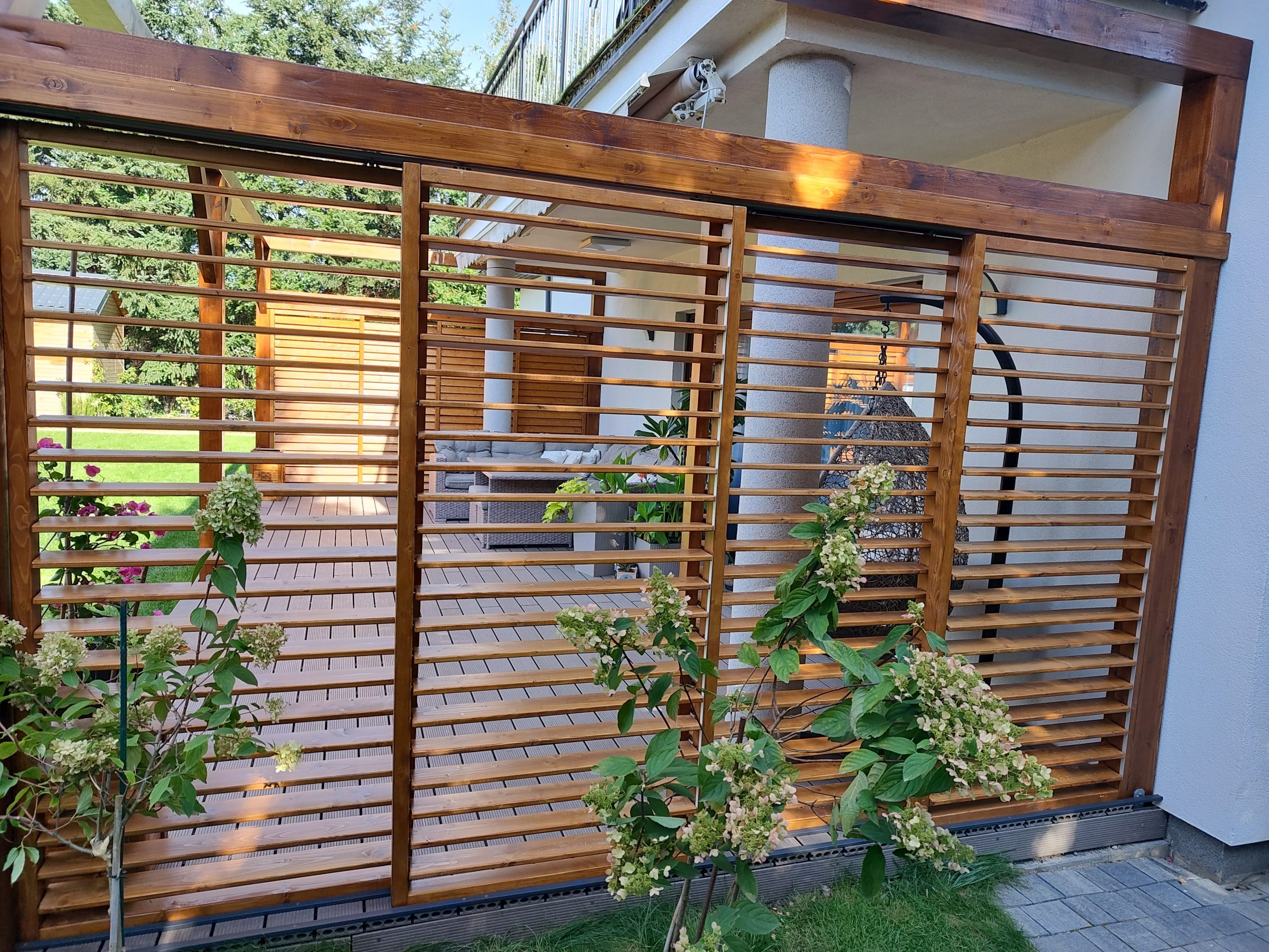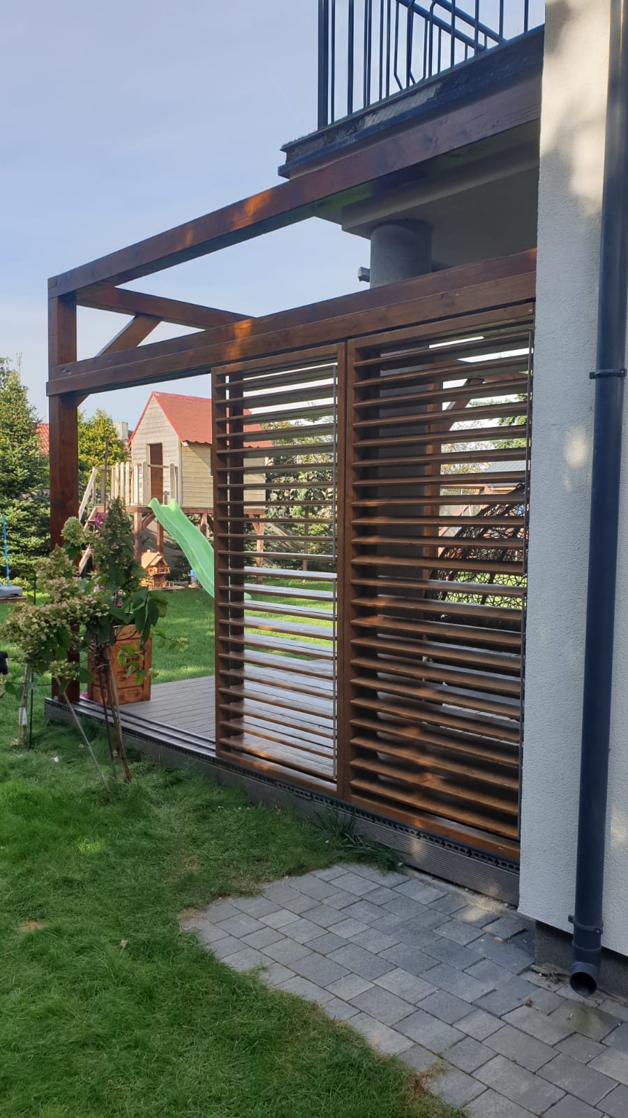 Zabudowa tarasowa z drewnianymi, ruchomymi i przesuwnymi żaluzjami