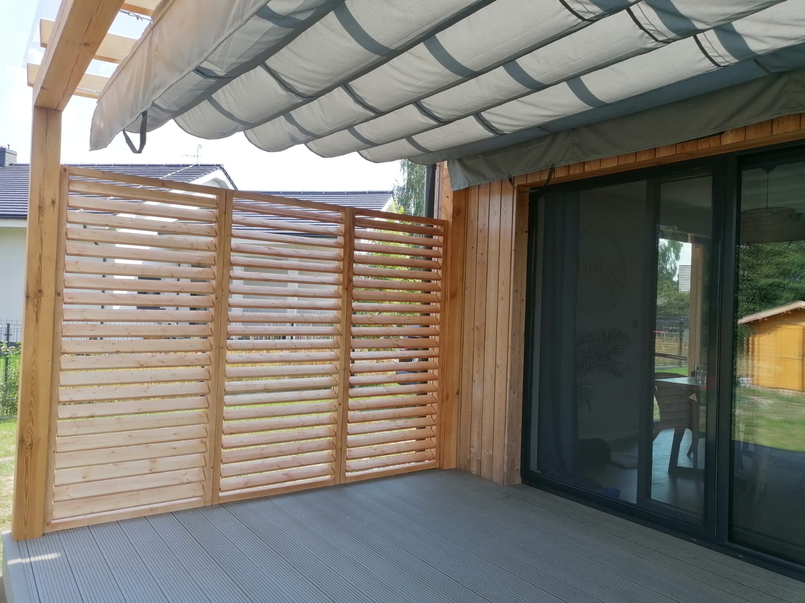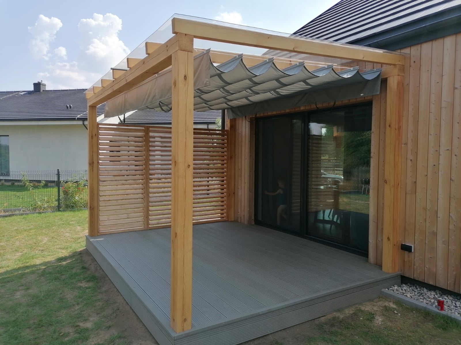 Dzięki połączeniu drewna, rzymskiej rolety i poliwęglanu, zadaszony taras staje się funkcjonalnym i atrakcyjnym miejscem do wypoczynku na powietrzu przez cały rok. Jednocześnie elegancki wygląd konstrukcji sprawia, że doskonale komponuje się z otoczeniem ogrodowym, tworząc przyjemną atmosferę relaksu dla domowników i gości